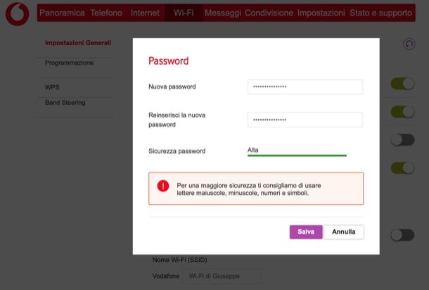 Ora, se disponi della Vodafone Power Station, seleziona la scheda Wi-Fi in alto, Controlla che nel menu a tendina Protezione sia indicata l’opzione WPA2 e premi il pulsante Cambia password, situato in corrispondenza del riquadro Wi-Fi principale. Per confermare le modifiche, premi il tasto Salva.