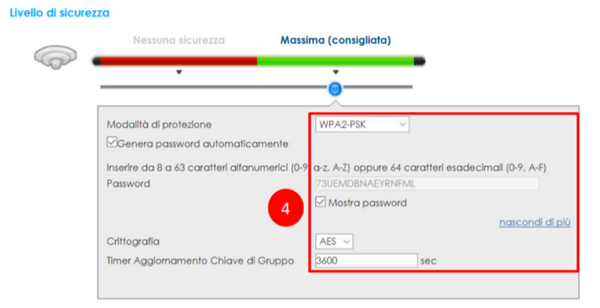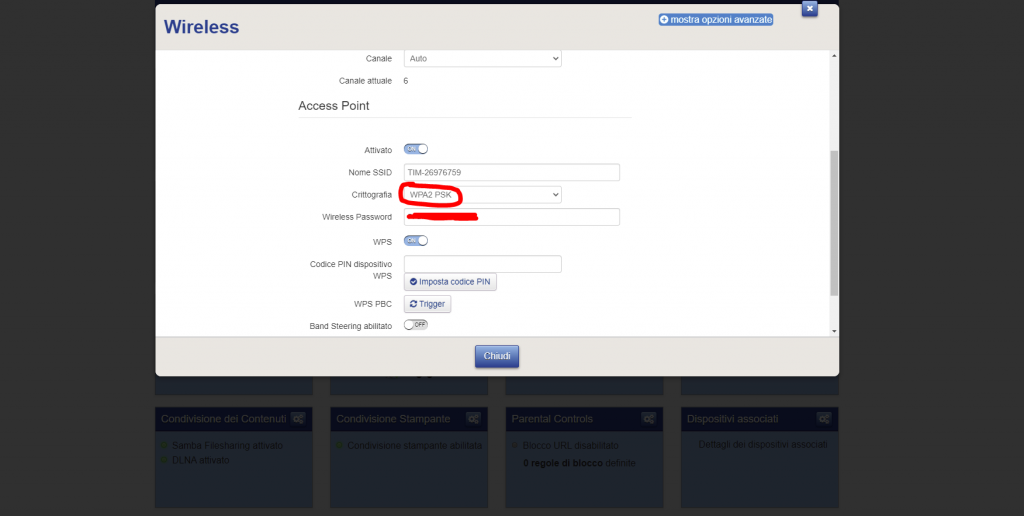 Assicurati di modificare la password con una chiave di rete che sia sicura e difficile da indovinare, lunga almeno 12 caratteri. Come modalità di cifratura, consiglio WPA2 oppure WPA2+WPA3, che rappresentano gli standard più sicuri.
