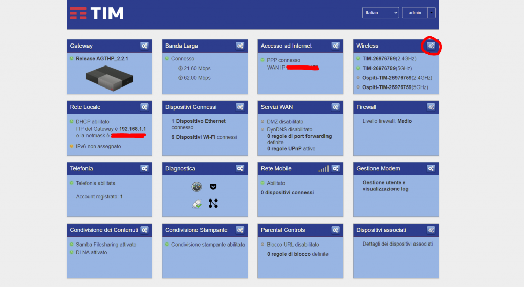 Dopo aver effettuato l’accesso, premi sul simbolo delle rotelle d‘ingranaggio del riquadro Wireless.