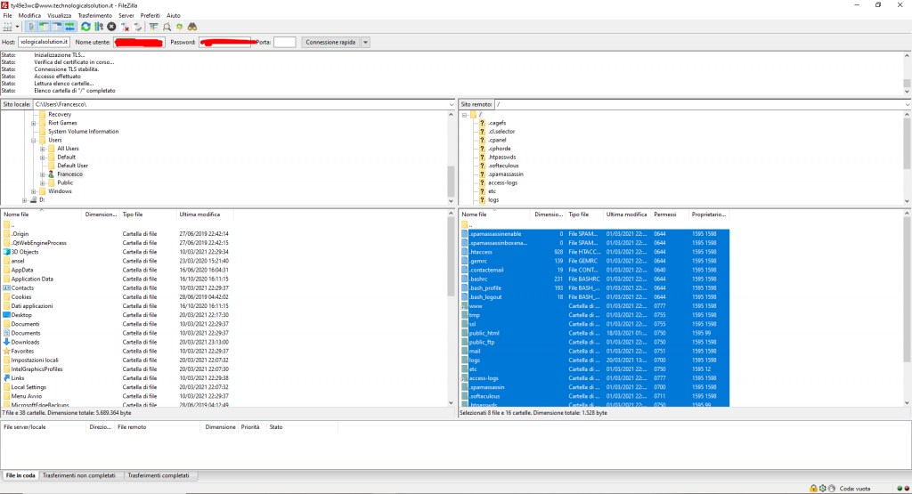 Bene ora sei dentro il tuo sito, come puoi vedere sulla destra ci sono tutti i file che lo riguardano, mentre sulla sinistra abbiamo i file e cartelle che contiene il PC. Non dovrai far altro che selezionare tutti i file del tuo sito internet (Sulla destra) e trascinarli sul desktop oppure una cartella specifica nella parte a sinistra. Personalmente consiglio di andare a creare sul desktop una cartella nominata “Backup-ora-giorno-nome sito”, e di andare a salvare i file in essa, cosi da avere una lista dei backup pulita ed ordinata.